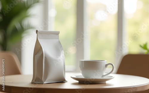 White Coffee Bag and Mug on Wooden Table in Sunny Interior variation 4. High quality