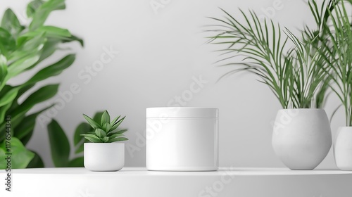 potted, plant, green, leaf, shelf, white, background, container, product, jar, cardboard box, design, blank, template, studio, clean, minimal, simple, modern, nature, botany, foliage, organic, room, home, interior, decor, display, presentation, cosmetic, skincare, beauty, health, wellness, illustration, rendering, image, visual, graphic, isolated, object, surface