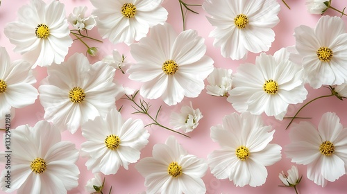 White Cosmos Flowers on Pink Background, Three white cosmos flowers with yellow centers against a pink background