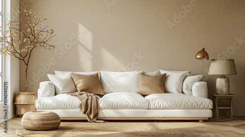 White couch with pillows and a table with a potted plant