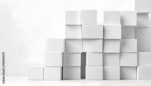 White cube boxes stacked on a plain background with random gaps and shifts, geometric, boxes, design