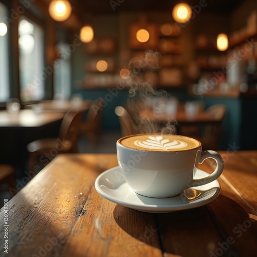 White cup coffee with latte art on vintage wooden table. Blurred cafe background. Morning coffee in restaurant. Latte with crema. Coffee break in cafe restaurant. Fresh hot beverage. Cozy cafe scene.