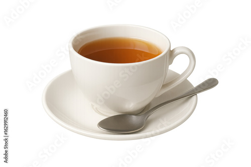White cup containing tea resting on matching saucer with teaspoon on transparent background