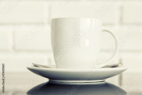white cup of hot coffee on top of glass table with white brick wall background. concept fot drink and food