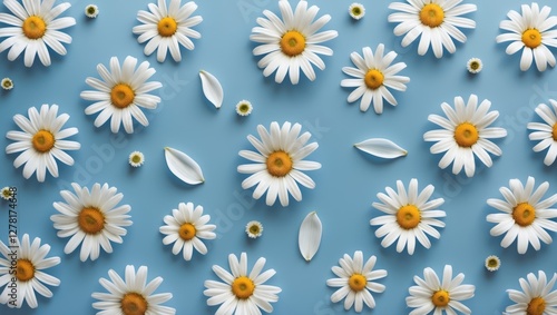daisy, flower, white, yellow, flower petals, bud, arrangement, composition, blue, background, floral, nature, botanical, season, spring, decoration, beauty, vibrant, texture, fresh, elegance, bloom, softness, delicate, natural, garden, flora, creative, artistic, cheerful, peaceful, design, aesthetic, style, visual, bright, sunny, colourful, assorted, random, organic, closeup, significant, group, pattern, harmony