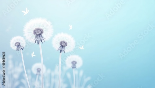 White Dandelion Flowers with Seeds Blowing in Wind – Blue Sky Background Illustration