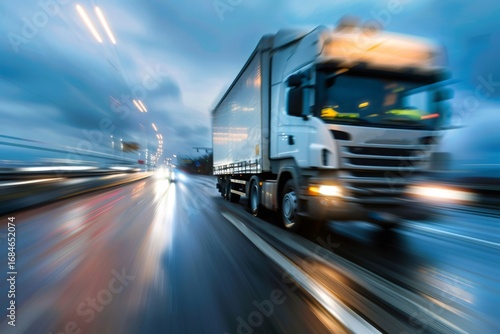 truck, delivery, transportation, logistic, shipping, highway, road, speed, motion blur, fast, dusk, night, wet, rain, asphalt, industry, freight, cargo, business, commerce, distribution, trucking, vehicle, automotive, travel, journey, transport, haulage, commercial, expressway, twilight