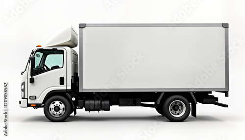 White delivery truck isolated on white background. Modern transportation vehicle with empty cargo area. Ideal for branding logistic concepts. Versatile commercial vehicle. Good for various uses.