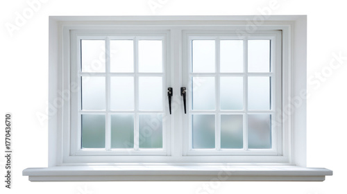 White double casement window with frosted glass panes, modern frame, and window sill, isolated on transparent background, suitable for home interior or exterior design concepts