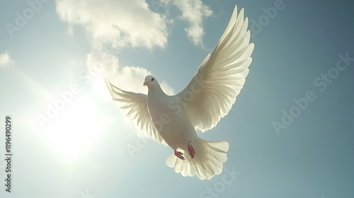 White dove soaring, sunlit sky, peaceful flight, hope symbol