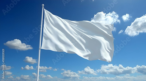 White Flag Flies Proudly Against a Vibrant Blue Sky with Fluffy White Clouds Gently Drifting By