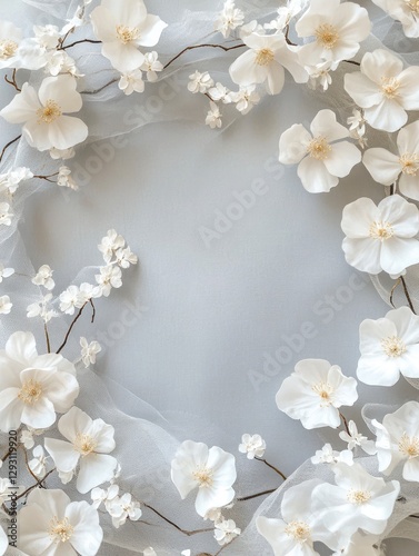 White flowers frame the background with copy space for text. The background features delicate white blossom