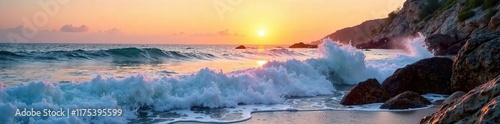 White foamy waves crashing on the rocky shoreline at sunset, wave crashes, rocky coastline