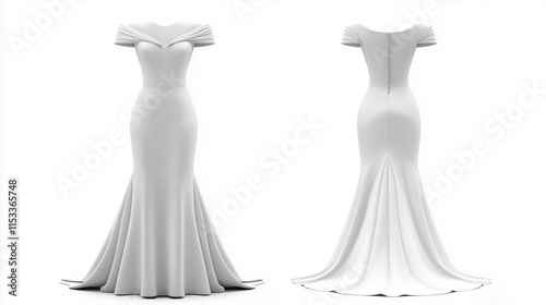 White formal wedding dress mockup front and back view isolated on white background for brand presentation