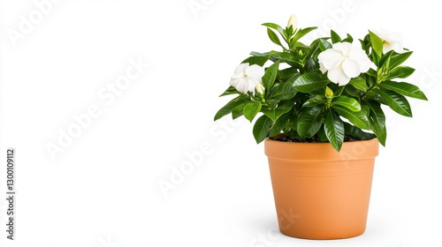 gardenia, white, flower, terracotta, pot, plant, green, potted, bloom, blossom, foliage, houseplant, flora, botany, nature, floral, photo, studio, shot, isolated, background, bright, fresh, clean, simple, elegant, delicate, lush, vibrant, spring, summer, beauty, natural, still, life, home, decor, interior, design, flower, gardening, horticulture, close, up, macro, detail, texture, organic, growth