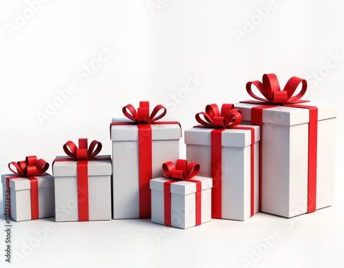 White gift boxes with red ribbons arranged in row from smallest to largest against plain white backdrop. Boxes stacked in way shows increasing sizes. Wrapped with red ribbons, bows. Image conveys