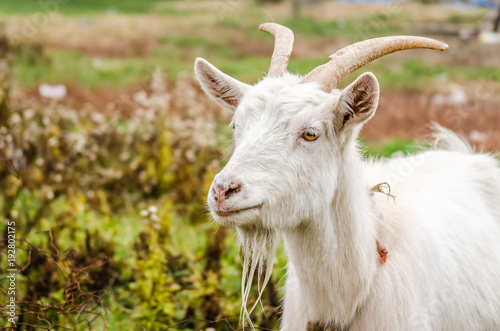 White goat on a green pasture on the grass