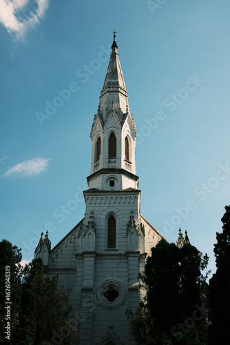 White gothic-style church tower with detailed spire and cross in Zrenjanin, Serbia. Bright sky and architectural contrast enhance the historic feel of the landmark.