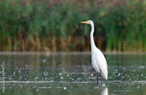 White heron in the pond. Photograph of a white heron in a natural environment.