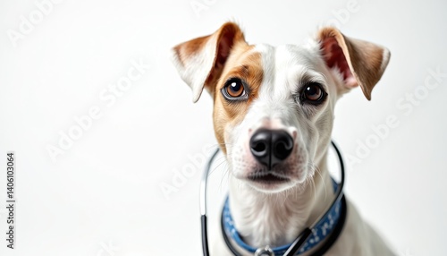 dog, jack russell, terrier, puppy, stethoscope, pet, animal, vet, vet, doctor, health, care, medicine, clinic, treatment, wellness, cute, white, brown, portrait, head shot, studio shot, purebred, domestic, canino, mammal, young, friendly, adorable, health care, medicals, hospital, help, healing, protection, love, friendship, companion, loyalty, happy, smiling, cheerful, playful, breed, pedigree, fur, nose