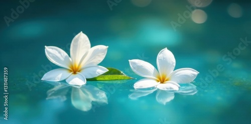 White jasmine blossoms float on blue water, sun-dappled , delicate, summer, image