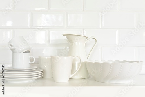 cup, hot drink, tea, white, texture, drink, breakfast, table, mug, bowl, kitchen, ceramic, plate, porcelain, cafes, saucer, beverage, teapot, cup, espresso, empty, tableware, food, set, morning, crockery, interior, dish