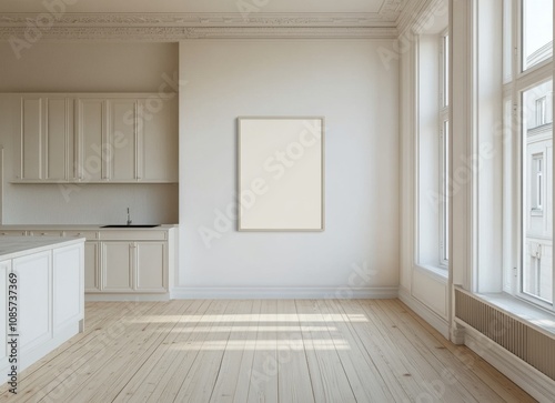 white kitchen with light wood floors, large windows on the right side, and cabinets in soft beige tones