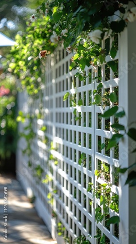 fence, lattice, white, green, plant, vine, ivy, flower, garden, overgrown, outdoors, sunlight, shadow, path, paseo, detail, foliage, closeup, nature, exterior, summer, decorative, panel, shrub, blooming, architecture, design, horizontal, vertical, pattern, texture, structure, perspective, bright, light, decoration, leafy, vibrant, organic, growth, natural
