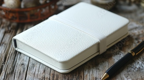 journal, notebook, writing, leather, white, diary, planner, textured, elegant, classic, paper, page, book, small, desk, office, stationary, accessory, gift, personal, thought, idea, note, record, memory, design, craft, hand-made, premium, quality, stylish, modern, simple, minimal, aesthetic, texture, smooth, cover, binding, closure, band, cord