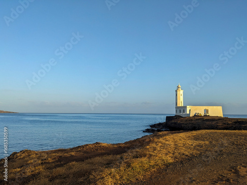White Lighthouse on Rocky Coastline Beside Calm Blue Sea Under Clear Sky in Cape Verde, Africa