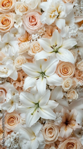 White lilies and peach colored roses closely packed to form a floral wall, detailed petals showcasing vivid textures, warm tones enhanced by soft natural lighting, minimalist composition
