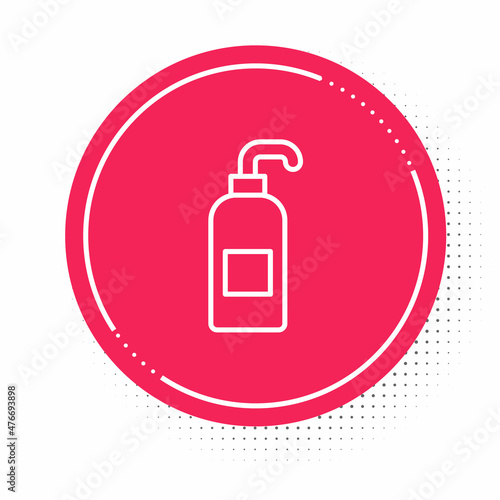 White line Bottle of liquid antibacterial soap with dispenser icon isolated on white background. Antiseptic. Disinfection, hygiene, skin care. Red circle button. Vector