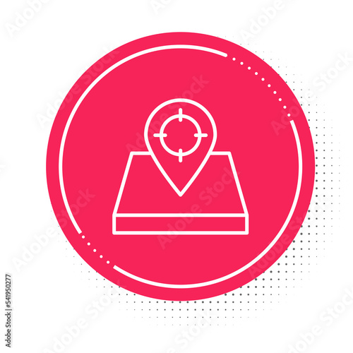 White line Hunt place icon isolated on white background. Navigation, pointer, location, map, gps, direction, place, compass, contact, search. Red circle button. Vector
