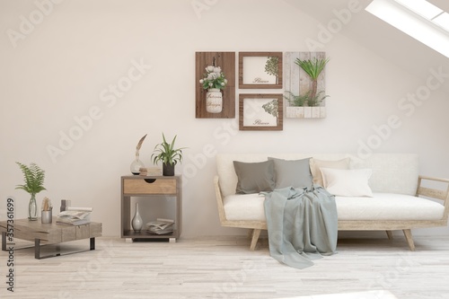 White living room with sofa. Scandinavian interior design. 3D illustration