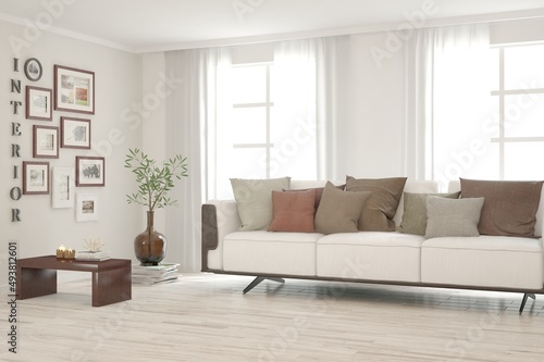 White living room with sofa. Scandinavian interior design. 3D illustration
