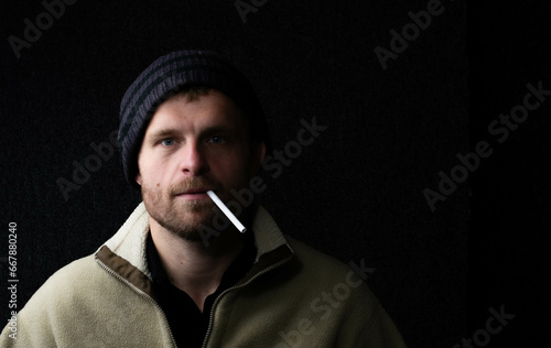 White man hipster or homes studio model smoking cigarets theme, isolated on dark background, fun abstract look