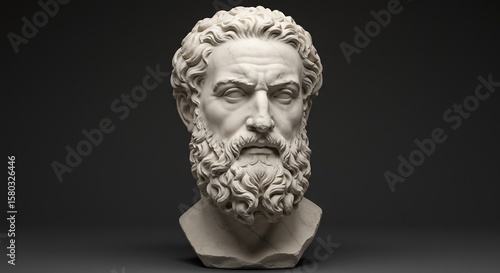 bust, sculpture, marble, statue, head, man, beard, curly, hair, ancient, classical, art, artwork, stone, white, grey, dark, background, studio, portrait, carving, masterpiece, museum, history, roman, greek, male, face, nose, eye, lip, chin, neck, chest, shoulder, front, view, still, object, figure, display, exhibit, fine, craft, relief, texture, detail, form, expression