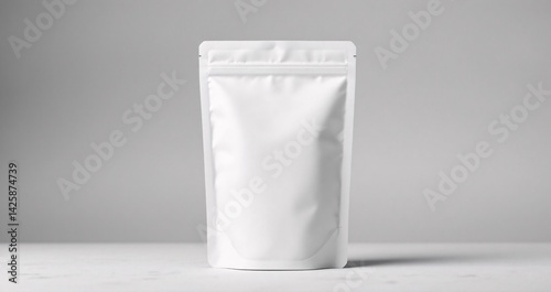 White matte standing pouch mockup isolated on soft gray background with clean diffused studio lighting, ideal for minimalist branding and packaging design.