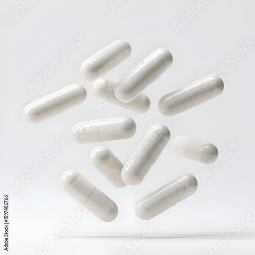 White medical capsules in mid-air against a plain white background. Floating capsules in a pharmaceutical setting.