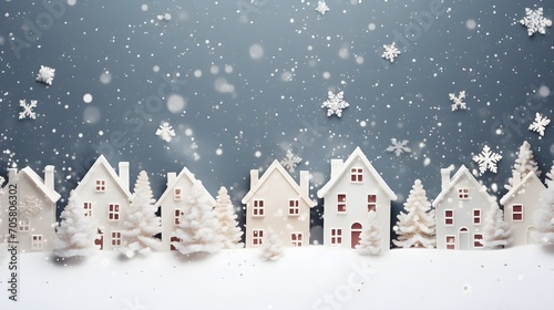 White miniature houses in row on bokeh blue blurry background, Christmas Holiday theme, snowing, bokeh lights landscape banner