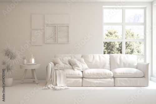 White minimalist living room with sofa. Scandinavian interior design. 3D illustration