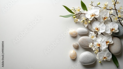white, orchid, orchid, flower, flower, blossom, bloom, flower petals, smooth, stone, rock, rock, grey, grey, beige, natural, zen, spa, relaxation, beauty, delicate, minimalist, simple, elegant, background, texture, leaf, leaf, green, tree branch, stem, bud, bud, tranquil, serene, peaceful, still life