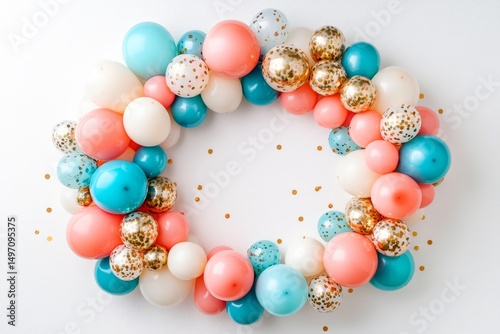 white party background with colorful balloons and golden confetti forming a celebratory frame, Generative AI