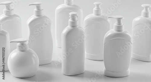 White plastic pump bottles in various shapes and sizes. A collection of empty bottles displayed on a light gray surface.