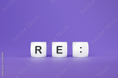 White plastic tiles with RE: sign stacked in violett background, 3d rendering. Letter cubes with RE: letters, business, work correspondence, e-mail and commercial concepts