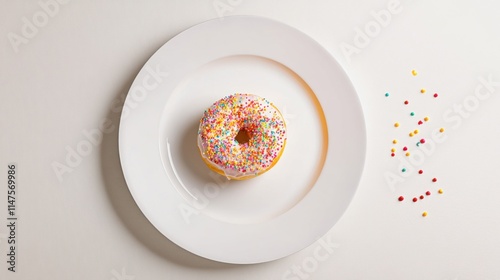 donut, white plate, single, topview, sprinkle, colourful, food, delicious, breakfast, sweet, treat, pastry, snack, fried, glazed