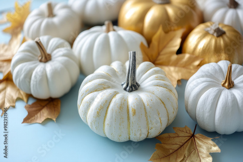 White pumpkins and autumn leaves on a pastel blue background. Seasonal fall theme