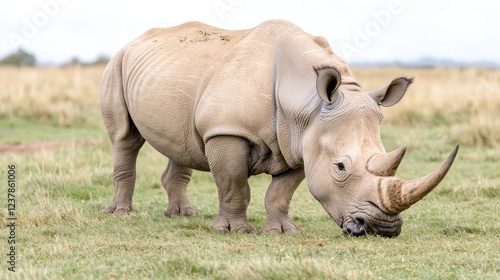 rhino, white rhino, grazing, savanna, africa, wildlife, animal, nature, mammal, horn, herbivore, wild, beast, creature, powerful, majestic, endangered, conservation, wilderness, safari, park, landscape, environment, ecology, fauna, flora, earth, planet, habitat, biodiversity, protection, preserve, travel, photo, image, picture