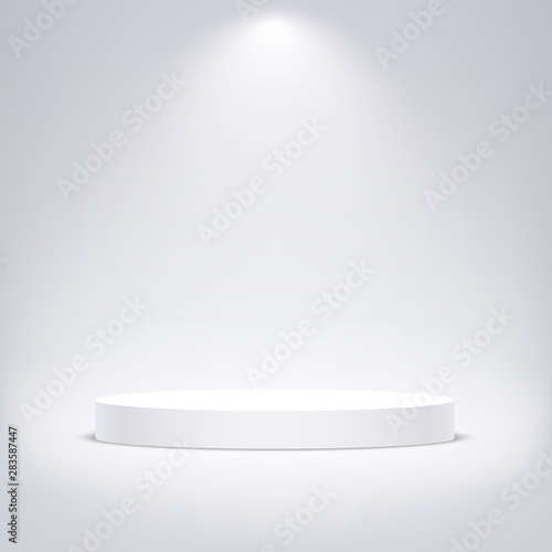 White round podium illuminated with light. Vector pedestal for product presentation.