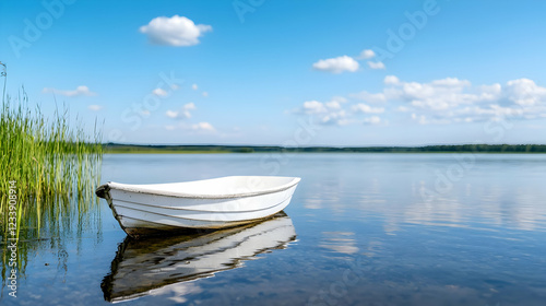 White rowboat on calm lake, reeds in foreground, blue sky